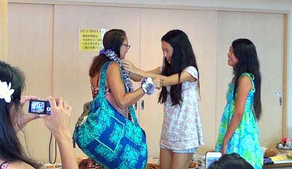 かんげいパーティではみなさんを代表(だいひょう)して先生(せんせい)にレイをプレゼント。